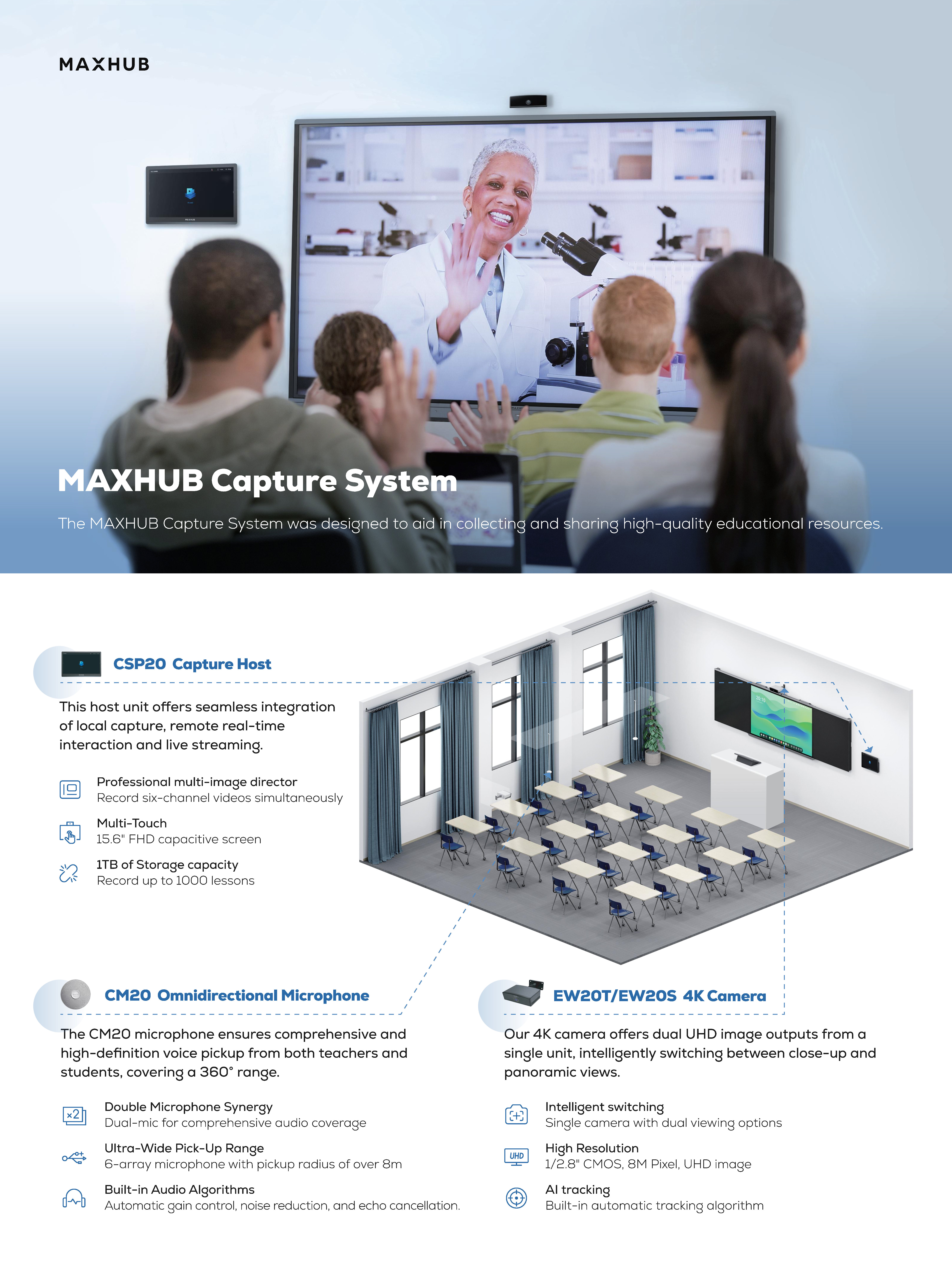 - ออกแบบมาเพื่อทำงานร่วมกับ MAXHUB Capture System 🔗 ผสานการทำงานได้อย่างลงตัวกับ CSP20 Capture Host และ CM20 Microphone เพื่อสร้างโซลูชันบันทึกการเรียนการสอนที่สมบูรณ์แบบ