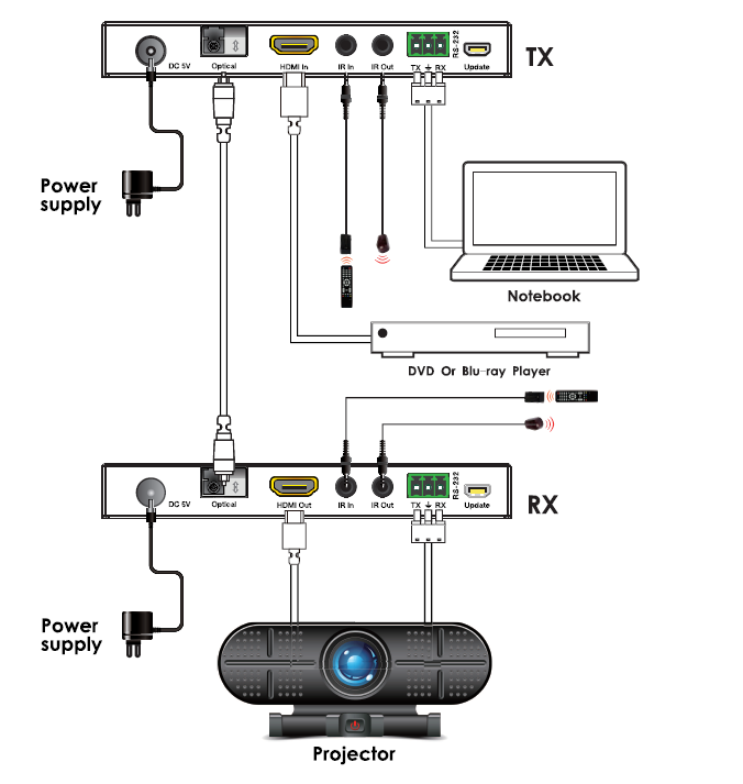 รองรับฟังก์ชันควบคุม Bi-directional Wideband IR และ RS-232 เพื่อควบคุมอุปกรณ์ต้นทางและปลายทางจากระยะไกล