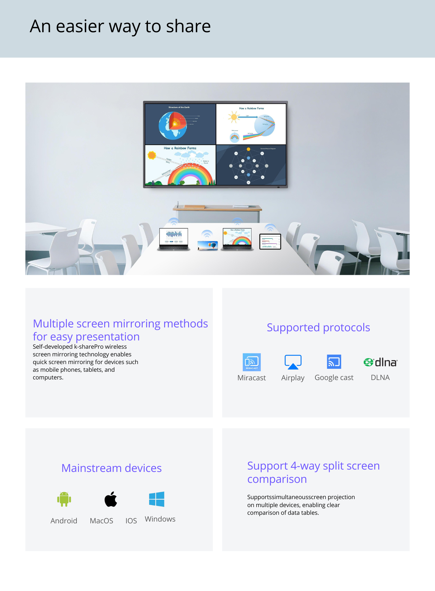 Screen Mirroring: รองรับ K-sharePro, Miracast, Airplay