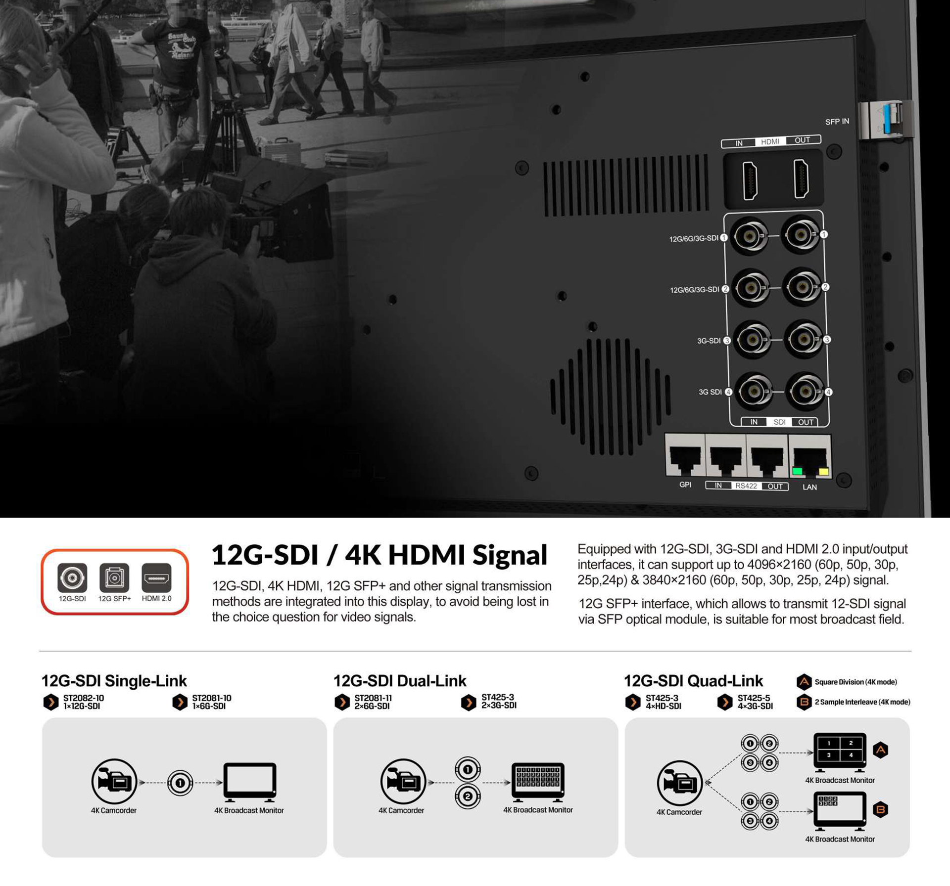 อินพุต SDI ระดับมืออาชีพ: มาพร้อมอินพุต SDI ถึง 4 ช่อง (2x 12G-SDI และ 2x 3G-SDI) พร้อมรองรับการเชื่อมต่อแบบ Single, Dual, และ Quad-link SDI