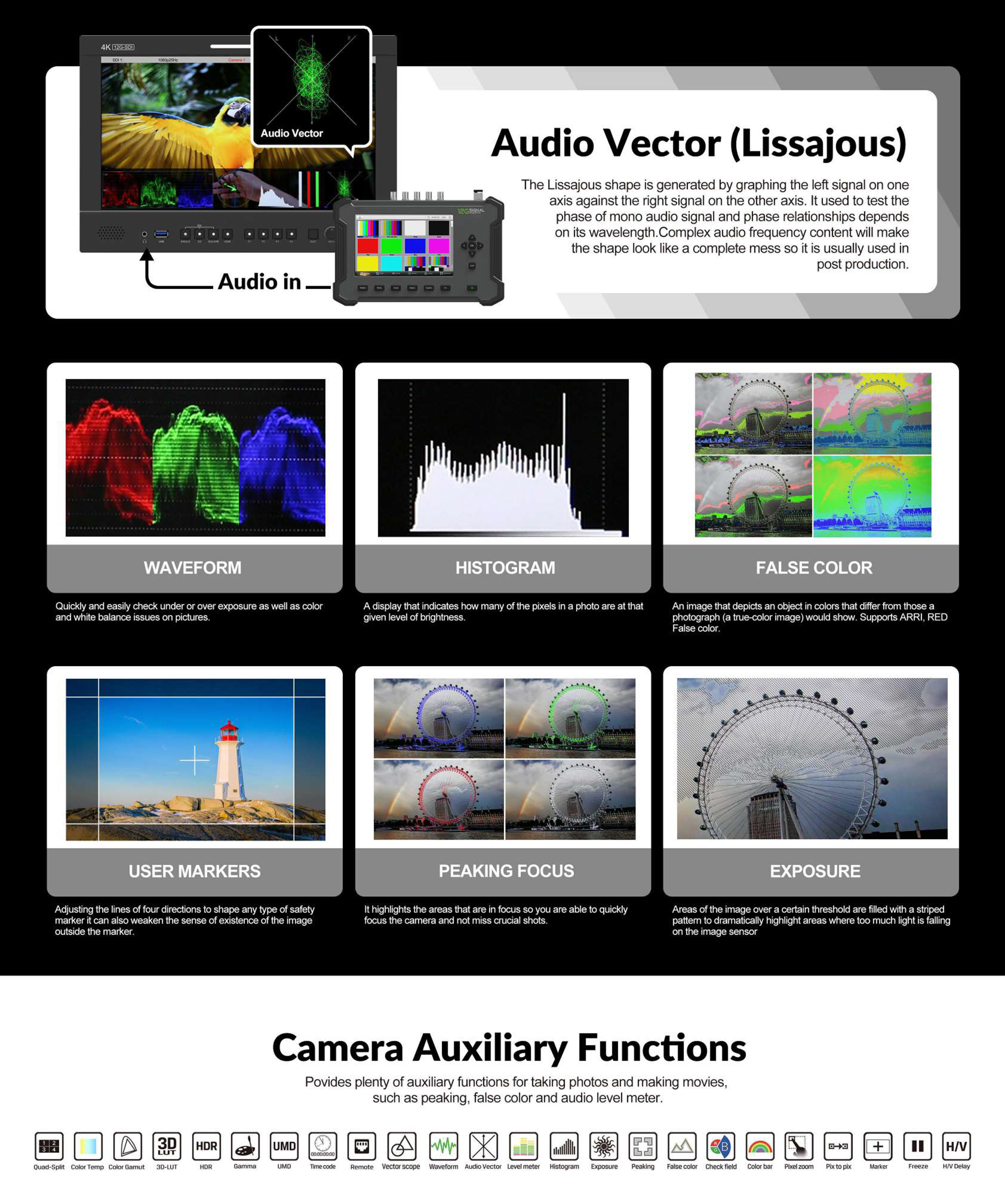• เครื่องมือช่วยในการถ่ายทำ: มาพร้อมฟีเจอร์ระดับมืออาชีพที่ครอบคลุม เช่น Waveform, Vectorscope, Histogram, Focus Peaking, False Color และ Audio Level Meters