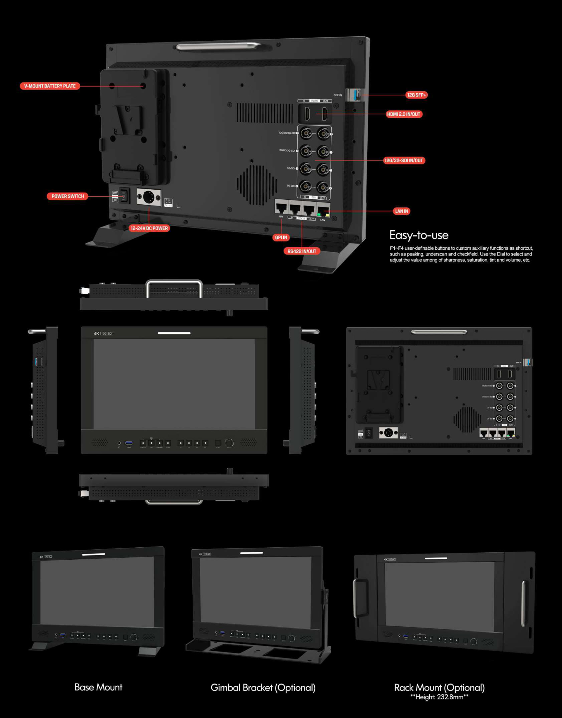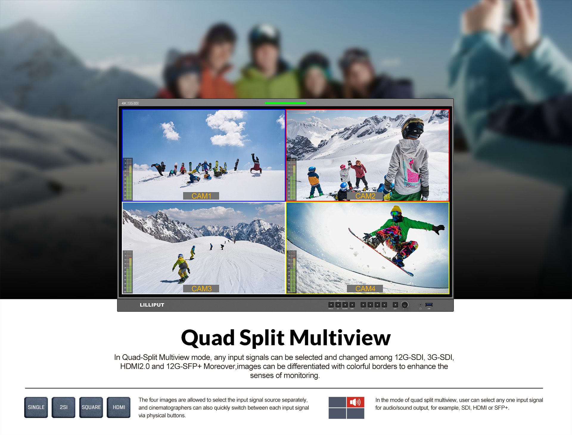 • การแสดงผลหลายหน้าจอ (Multiview): สามารถแสดงภาพจากแหล่งสัญญาณ SDI ที่แตกต่างกันได้สูงสุดสี่หน้าจอพร้อมกันในโหมด Quad View