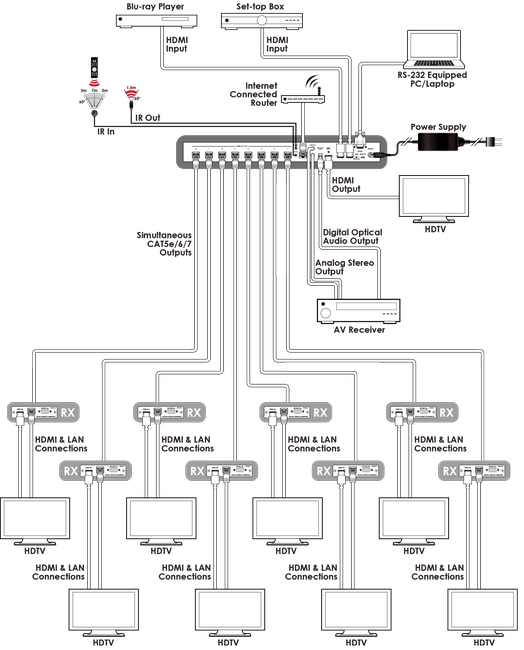 | Outputs | 8x RJ45 [8x HDMI & Propriety Data] 1x HDMI [1x Uncompressed AV and Data] 2x RCA [1x Stereo (L/R)] 1x TOSLINK [1x OPTICAL 2 Channel LPCM] |