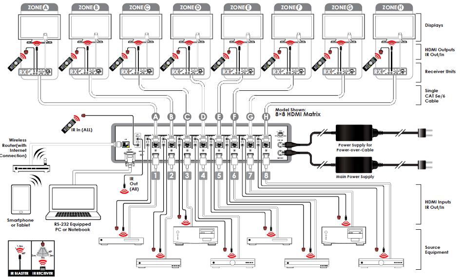 | Outputs | 8x RJ45 [8x HDMI & Propriety Data] 8x 3.5mm Stereo Mini-jack [8x Infrared Emitter] 1x 3.5mm Stereo Mini-jack [1x ALL Infrared Emitter] |