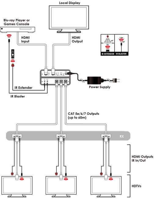 | Outputs | 1x HDMI [1x Uncompressed AV and Data] 3x RJ45 [3x HDMI & Propriety Data] 1x 3.5mm Stereo Mini-jack [1x Infrared Emitter] |