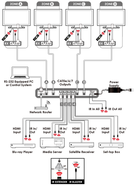 | Outputs | 4x RJ45 [4x HDMI & Propriety Data] 4x 3.5mm Stereo Mini-jack [4x Infrared Emitter] 1x 3.5mm Stereo Mini-jack [1x ALL Infrared Emitter] |