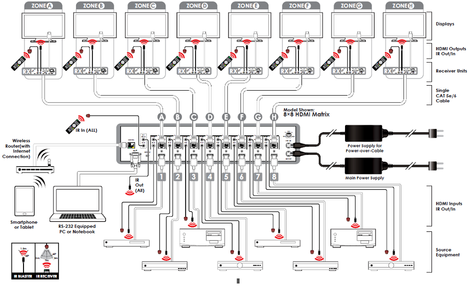 | Outputs | 8x RJ45 [8x HDMI & Propriety Data] 8x 3.5mm Stereo Mini-jack [8x Infrared Emitter] 1x 3.5mm Stereo Mini-jack [1x IR ALL Infrared Emitter] |