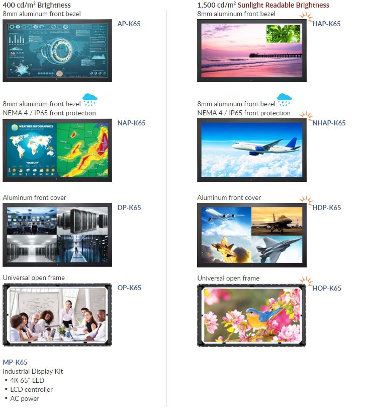 As a versatile 4K monitor, K65 is meticulously designed to meet professional and environmental demands including Sunlight readable brightness, IP54 Front protection, Multi-touch, Anti-reflective/Vandal proof glass, DC power input, Brightness dimming and Mounting kit for Overhead tilted wall-mount, Panel-mount, VESA-mount, Universal-mount and Desktop stand.